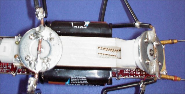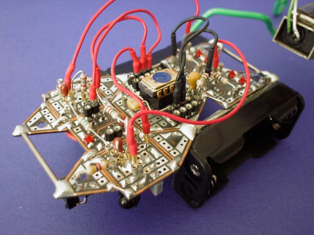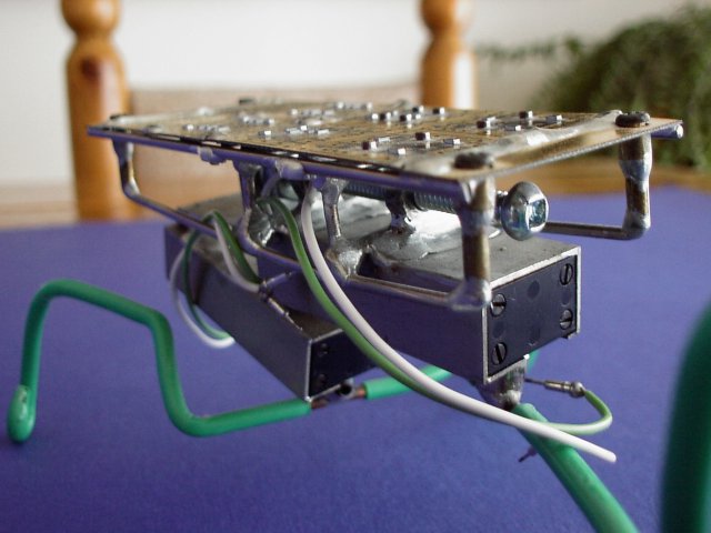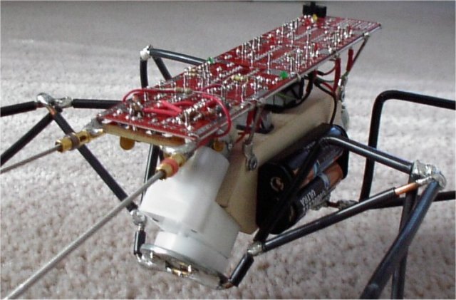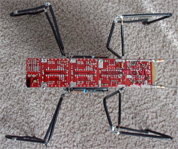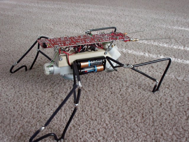 | Gnat was an exercise to design a two motor walker that would be easy for others to duplicate using of-the-shelf parts. Using BEP boards, Bio-Bug motors, standard screws and washers from a hardware store, and a block of light pine for the body.