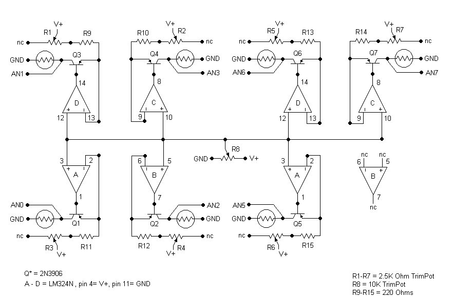 The reason I chose to use this particular circuit was because I had all the parts except the 2N4403 transistors, I used 2N3906's instead. The transistors lined up with the LM324 pin-for-pin too, which was nice.