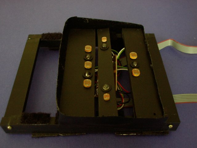 This project suffers from ambient light. At present there is no check or adjustments for ambient light levels. Maybe another cds cell on that unused LM324 op-amp pointed straight-up could take an ambient light level reading, and then adjust the value of black_limit before it is applied to the threshold filter.